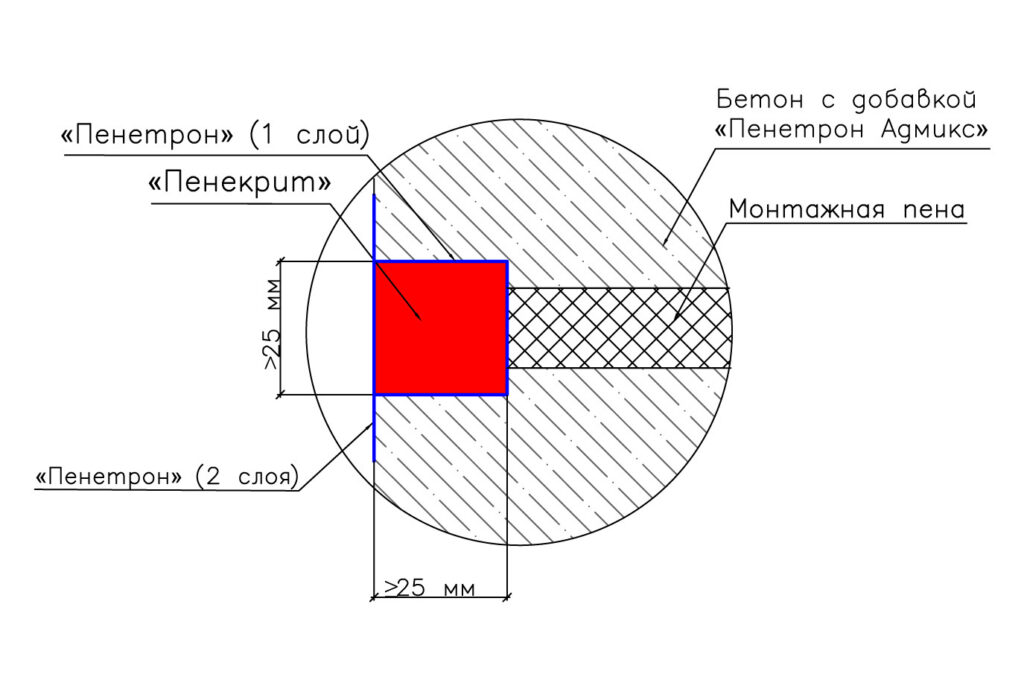 Гидроизоляция оставшихся в бетоне технологических отверстий после демонтажа съемной стеновой опалубки, смонтированной с помощью стальных шпилек с двумя гайками (тяжей), пропускаемых через несъемные пластиковые втулки, выполняется с применением гидроизоляционных смесей «Пенекрит» и «Пенетрон».